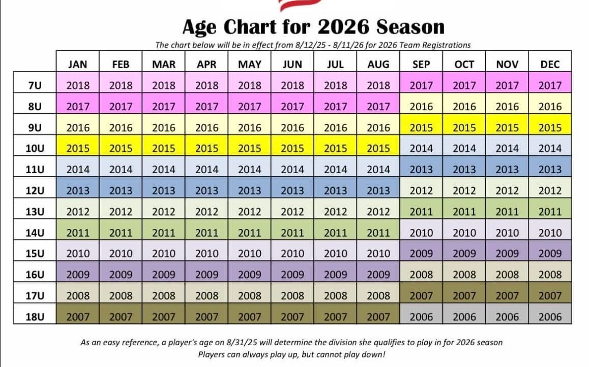 Please use this age eligibility chart for Tri-County softball. This chart is current for this fall through next summer's season at all divisions.